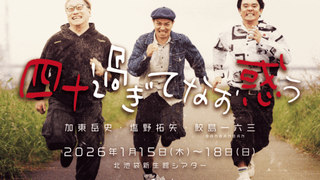 外部案件【加東岳史 出演 けんちゃん 脚本・演出】国産本マグロコント公演「四十過ぎてなお惑う」【外部案件】 加東岳史が所属するエンタメユニット「国産本マグロ」のコント公演「四十過ぎてなお惑う」に、加東岳史が出演、けんちゃんが脚本・演出として参加いたします。国産本マグロコント公演『四十過ぎてなお惑う』2026年1月14日(水)〜1月18日(日)全4... 2026.01.04外部案件